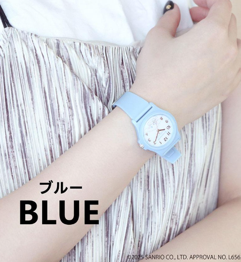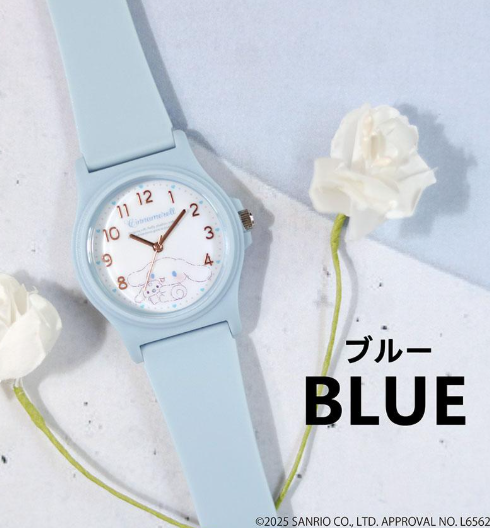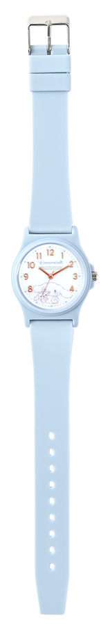 Cinnamorollがデザインされた、やさしいパステルカラーが魅力のファッションウォッチです。爽やかなブルーカラーのベルトと、文字盤に描かれたシナモロールのかわいいイラストが、腕元を明るくキュートに演出します。
