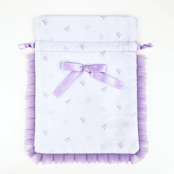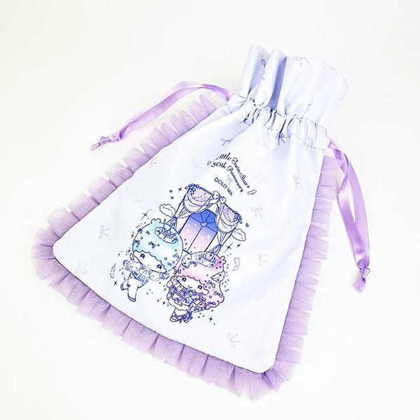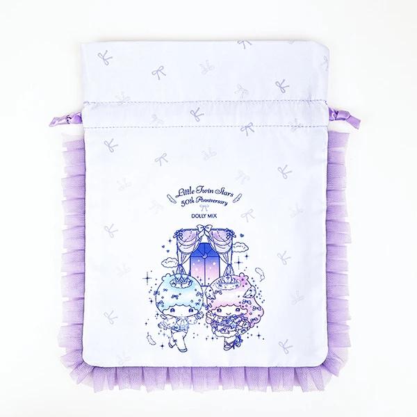 キキララ 50th×DOLLY MIXの可愛いフリル巾着です。メイク用品を入れたり、小物入れとしてぴったりなサイズ感☆フリルとリボンがとってもキュートなので可愛い物が好きな方におすすめのアイテムです♪
