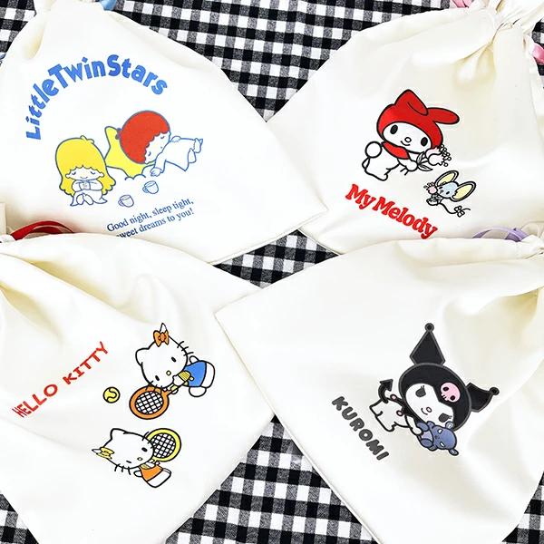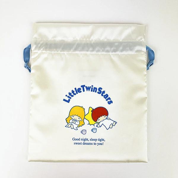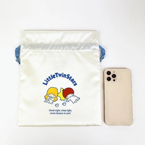 キキララのフレンズ巾着です。お菓子や小物入れにぴったりのサイズ感☆紐が差し色になっていて注目◎光沢感のあるサテン生地がとってもキュートです♪