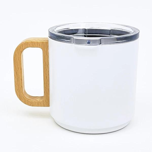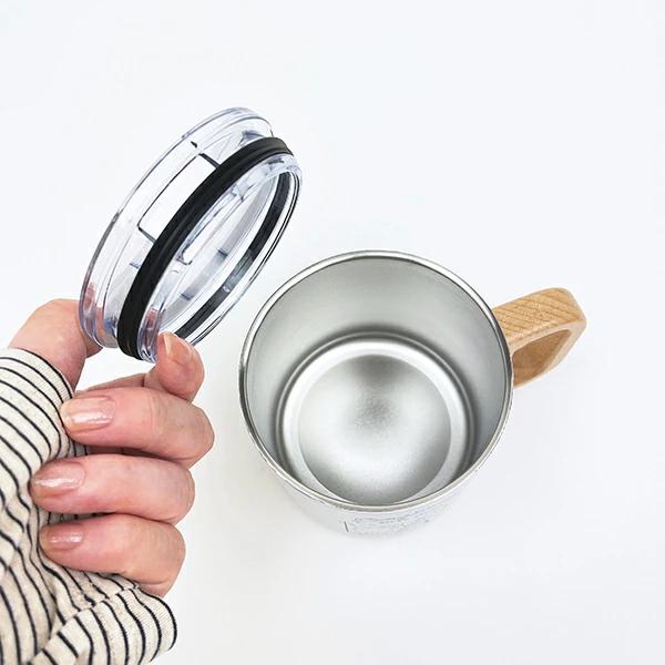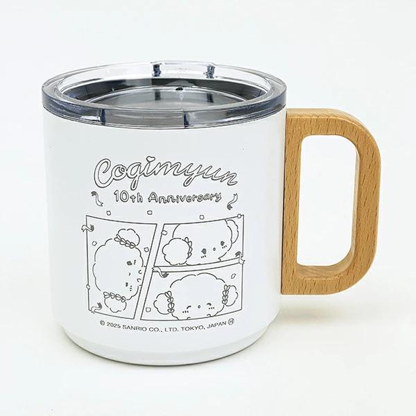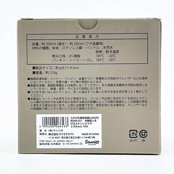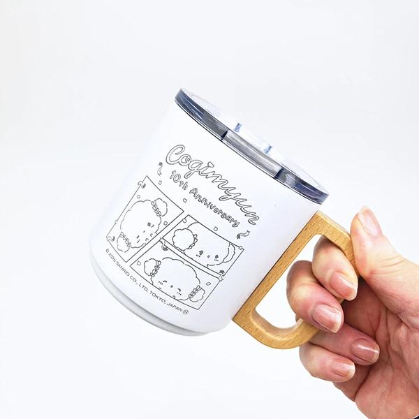 こぎみゅんの10周年を記念して作られた取っ手付きステンレスマグです。取っ手が天然木なので、全体的に落ち着きのある雰囲気のある仕様に。 蓋付きなので、オフィスの使用もオススメ♪ 冷たい・温かい飲み物も両方OK! こぎみゅん好きの方へのギフトもオススメです☆彡 ※電子レンジ・食洗機 使用不可!