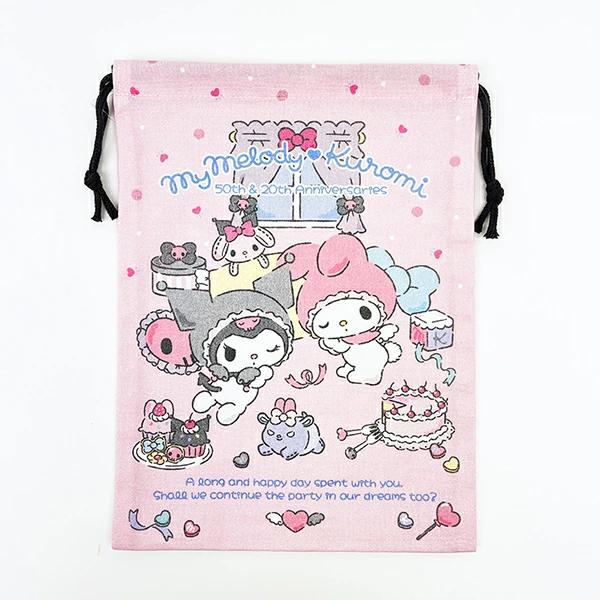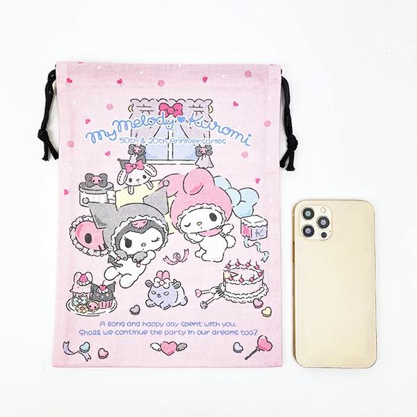 マイメロディ50周年&クロミ20周年デザインの巾着です。天使姿がとってもキュート☆女の子らしい可愛いデザインなのでバッグの中に入れておくだけで気分が上がりそう~♪サンリオ好きの方へのプレゼントにも◎メイク用品や小物入れにちょうどいいサイズ感です☆彡