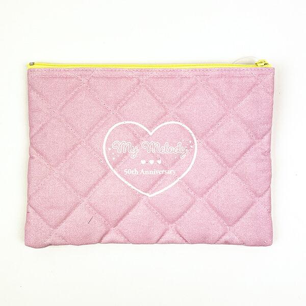 マイメロディの50周年デザインのキルティングポーチです。もこもこなキルティング生地とファスナーの色がアクセントになっています☆ガーリーでポップなマイメロちゃんデザインが可愛い♪ぜひ周年のお祝いにいかがですか?