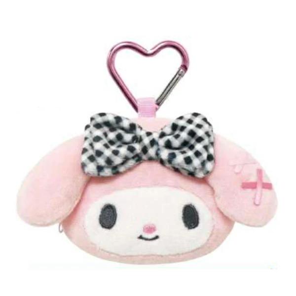 マイメロとクロミがお揃いのギンガムリボンを付けた仲良しシリーズ♪小物や小銭を入れて使ってね!ハート型のカラビナが可愛い!