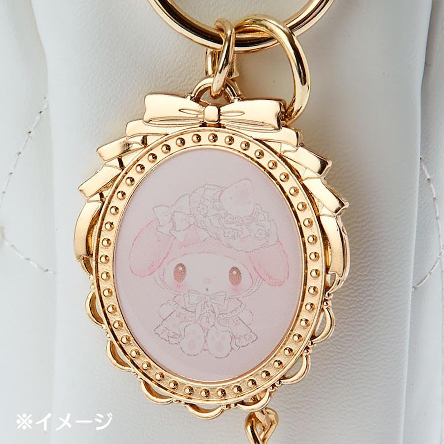 ヴィンデージガーリーなマイメロディ 白いちごのティータイムデザインシリーズ。白いちごがそのままポシェットになったような楽しいデザイン。マイメロディのカメオ風チャームがかわいいアクセント。