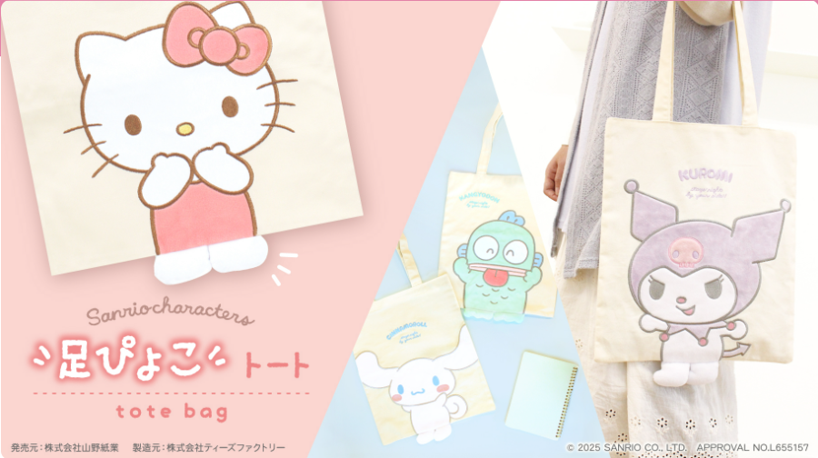 サンリオキャラクターズの「足ぴょこトート」が新登場!ふわふわワッペンのキャラクターと、ぴょこっと飛び出した足がかわいいね♡A4サイズも収納できて、お出かけにもピッタリだよ♪サイズ:約H390×W330mm素材:ポリエステルJANコード:4548626231157