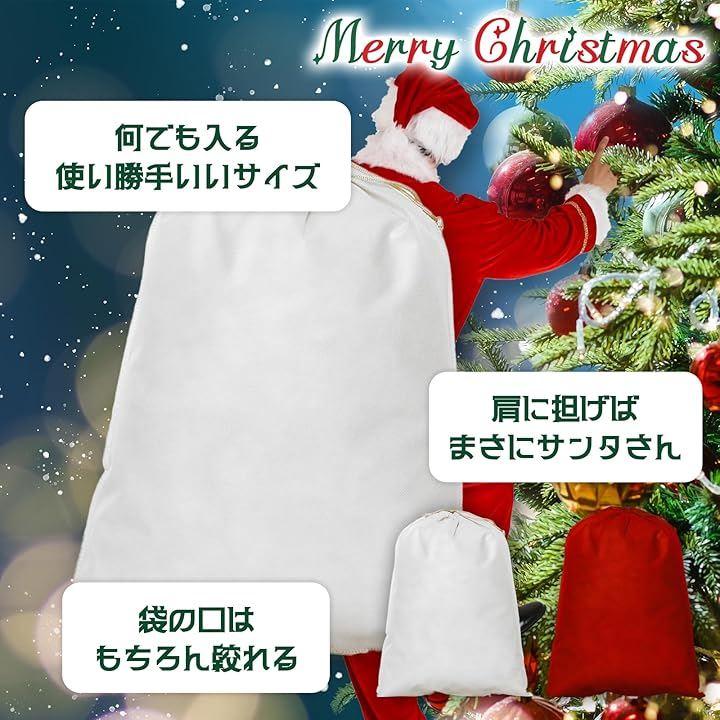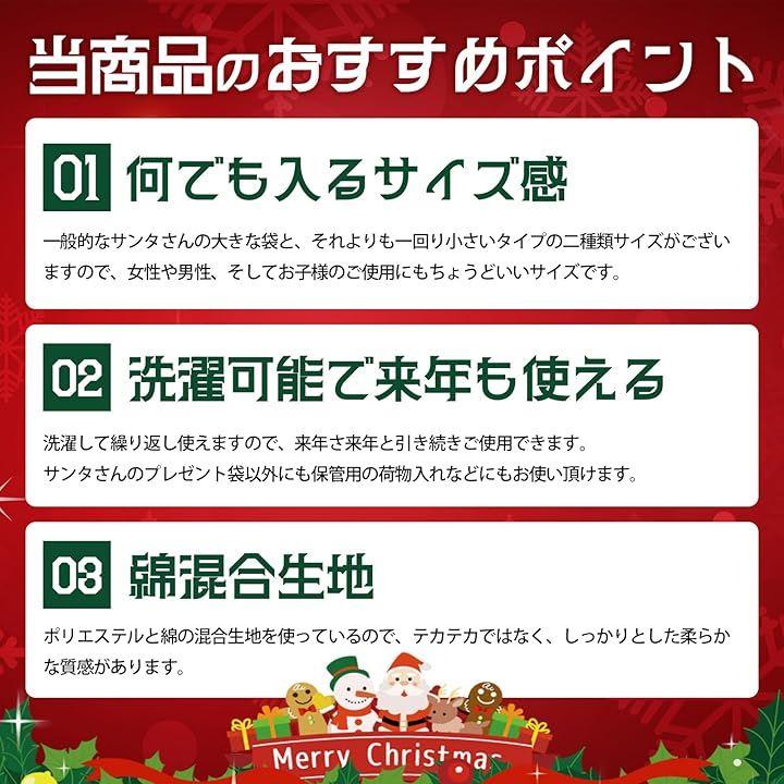一般的なサンタさんの大きな袋と、それよりも一回り小さいタイプの二種類サイズがございますので、女性や男性、そしてお子様のご使用にもちょうどいいサイズです。
