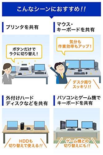 2台のパソコンで1台のUSB機器を共有できるUSB切替器です。ボタン一つで簡単に切り替えることができます。複数のパソコンでプリンタやマウス・キーボード、外付けハードディスクの共有に便利です。現在接続されているパソコンがわかるLEDランプ付きで、接続状況がひと目でわかります。ボタンを押すとカチッと音がするので、ボタンを押せたかが分かりやすくなっています。コンパクトなのでデスクスペースを圧迫しません。