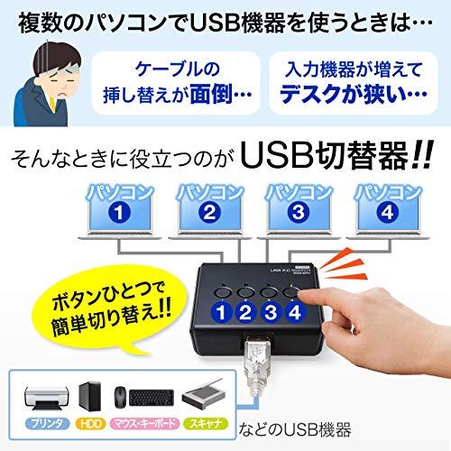 4台のパソコンで1台のUSB機器を共有できるUSB切替器です。ボタン一つで簡単に切り替えることができます。複数のパソコンでプリンタやマウス・キーボード、外付けハードディスクの共有に便利です。現在接続されているパソコンがわかるLEDランプ付きで、接続状況がひと目でわかります。ボタンを押すとカチッと音がするので、ボタンを押せたかが分かりやすくなっています。コンパクトなのでデスクスペースを圧迫しません。本体を立てて設置できるスタンド付きです。