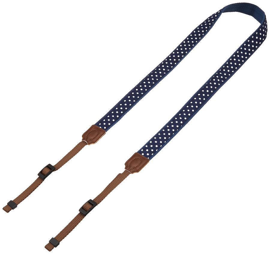 小型デジタル一眼にちょうどいい幅のストラップ。大人かわいい水玉柄。ブルー。