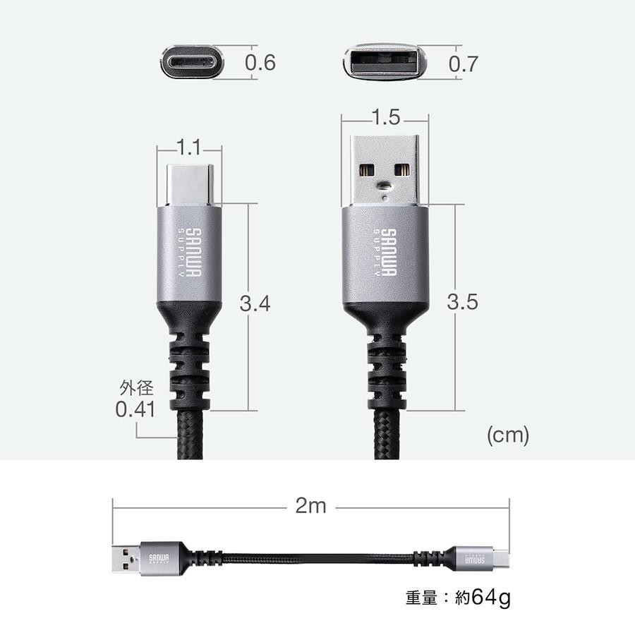 ●USBポート(USB2.0 Aコネクタメス)を持つパソコンや充電器やモバイルバッテリーなどの機器と、USB Type-Cポートを持つ周辺機器を接続する時に使用するケーブルです。●最大15W(5V/3A)で接続機器の充電が可能です。※USB Power Delivery非対応です。●最大480Mbpsの高速データ転送が可能です。●ハイエンドで美しく、頑丈で耐摩耗性があるアルミのコネクタを採用しています。●外皮にポリエステルメッシュを採用しており、高密度編組で覆われて強度と靭性が高く断線しにくいケーブルです。●非塩ビ素材を使用しており、焼却時に有害な物質を発生せず、環境に優しいパッケージです。■ケーブル長:2m■ケーブル径:4.1mm■コネクタ形状:USB2.0 Type-Cコネクタオス-USB2.0 Aコネクタオス■規格:USB2.0/USB1.1■重量:約32g■線材難燃性:VW-1