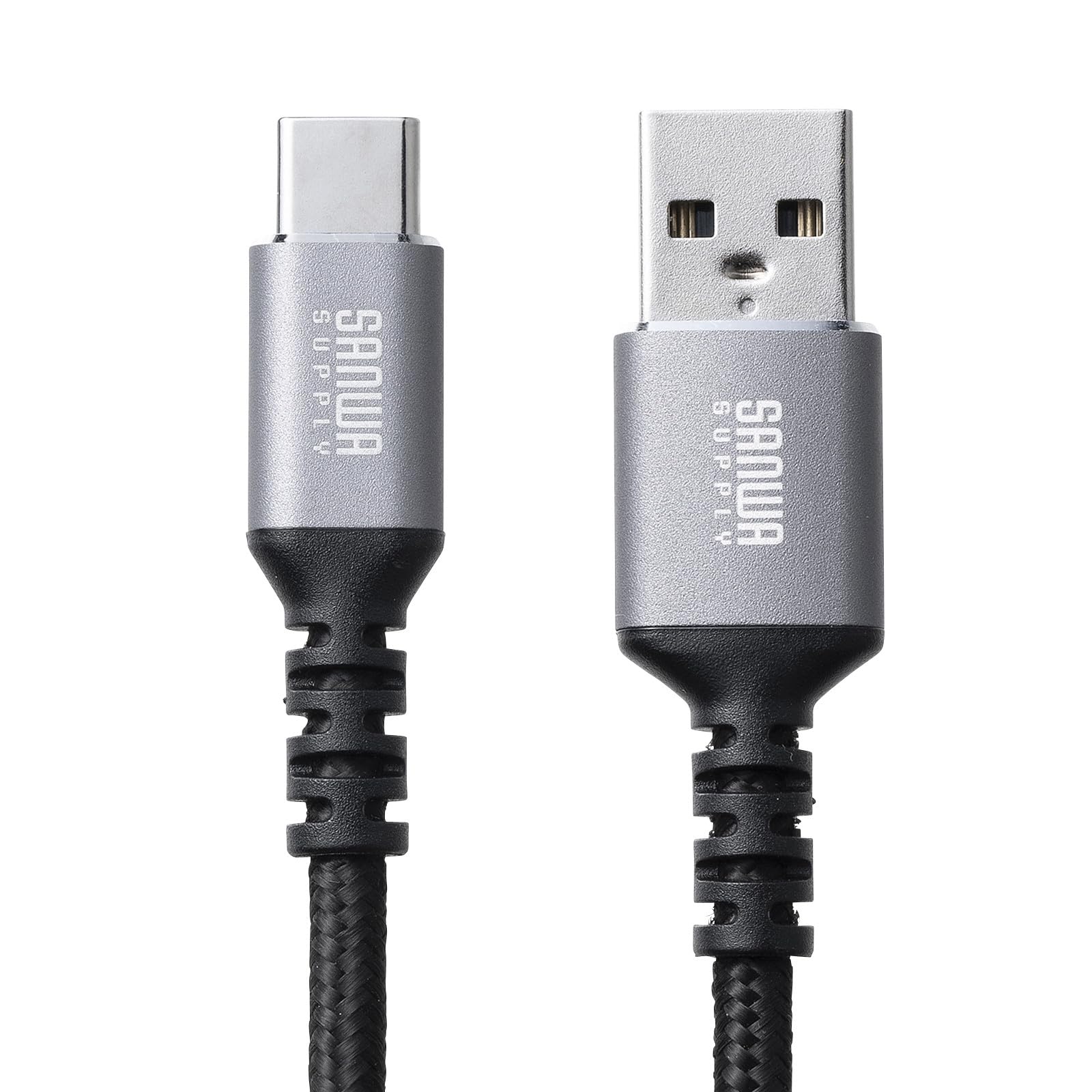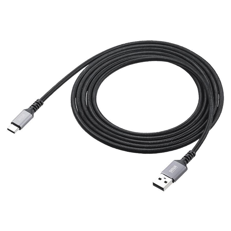 USBポート(USB2.0 Aコネクタメス)を持つパソコンや充電器やモバイルバッテリーなどの機器と、USB Type-Cポートを持つ周辺機器を接続する時に使用するケーブルです。最大15W(5V/3A)で接続機器の充電が可能です。※USB Power Delivery非対応です。最大480Mbpsの高速データ転送が可能です。ハイエンドで美しく、頑丈で耐摩耗性があるアルミのコネクタを採用しています。外皮にポリエステルメッシュを採用しており、高密度編組で覆われて強度と靭性が高く断線しにくいケーブルです。