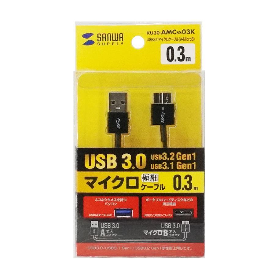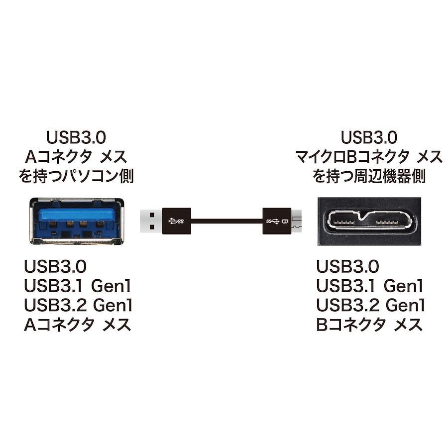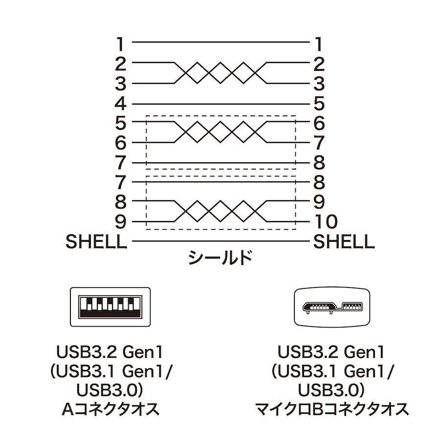 ●USBポート(Aタイプ)を持つパソコンと、ハードディスクなどUSB機器(USB3.0 microBタイプメス端子を持つ機種)を接続するケーブルです。●USB IF(USB Inprementers Forum)で認証されたUSB3.0規格認証ケーブルです。USBポート(Aタイプ メス)を持つパソコンと、ハードディスクなどの周辺機器(USB 3.0・USB 3.1 Gen1・USB 3.2 Gen1対応ポートを持つ機種)を接続するケーブルです。●USB 3.2 Gen 1・USB 3.1 Gen 1・USB 3.0 の環境で最大5Gbps(理論値)の転送スピードを実現しています。●直径約2.5mmのごく細ケーブルと小型コネクタ(カバー部14.5×13×5.5mm/SR部、コネクタ部は除く)を採用しています。●USB3.0信号線用のSDP(Shielded Differential Pair)線は中心から「アルミシールド→アルミシールド→横巻きシールド」と三重のシールド処理となっています。●芯線を2本ずつよりあわせたノイズに強いツイストペア線を使用しています。●錆にも強く、経年変化による信号劣化の心配が少ない金メッキ処理を施したピン(コンタクト)を使用しています。 ※USB 3.2 Gen 1・USB 3.1 Gen 1・USB 3.0は呼び方が違うだけで同じ意味です。データ転送の性能は同じなので本製品は3つの規格(規格名)に対応しています。ただしUSB 3.2 Gen 1には 2種類のモード(USB 3.2 Gen 1×1とUSB 3.2 Gen 1×2)があり、USB 3.2 Gen 1×2のモードには本製品は対応していません。■カラー:ブラック■コネクタ形状:USB 3.0 Aコネクタオス-USB 3.0 マイクロBコネクタオス(USB Type A - USB Micro B)または(USB Standard-A - USB Micro-B)、USB 3.2 Gen1・USB 3.1 Gen1 対応■ケーブル長:約0.3m(SR間)■ケーブル径:約2.5mm■規格:SuperSpeed USB 5Gbps(USB 3.2 Gen1・USB 3.1 Gen1・USB 3.0)※USB 3.2 Gen 1×2のモードには非対応。■重量:約8g