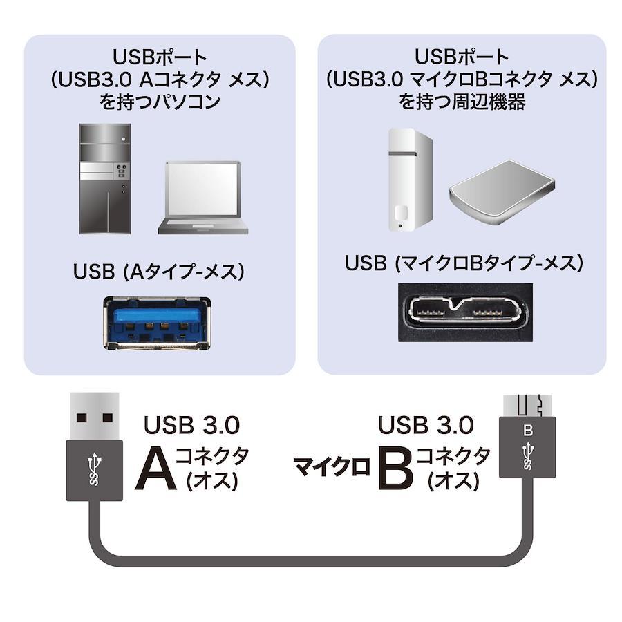 USBポート(Aタイプ)を持つパソコンと、ハードディスクなどUSB機器(USB3.0 microBタイプメス端子を持つ機種)を接続するケーブルです。