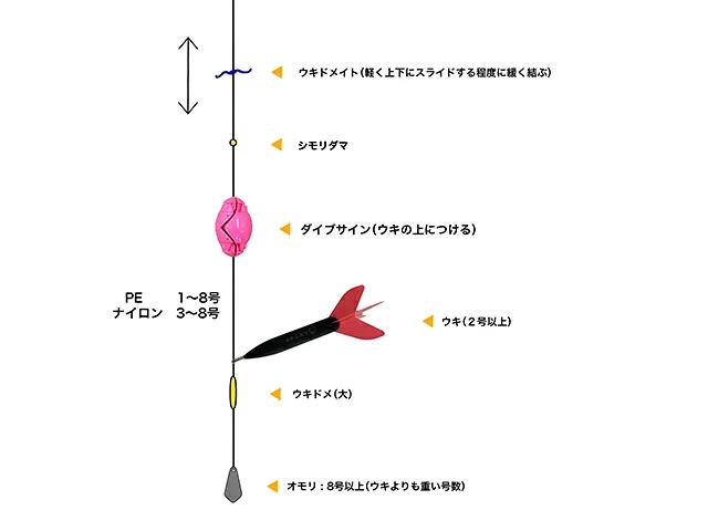 ウキ上に付けてポイントに投げれば、一回で正確に水深を測れます。ウキの浮力でスルスル海面まで移動。ミチイトを張ればがっちり止まって水深をキープ。