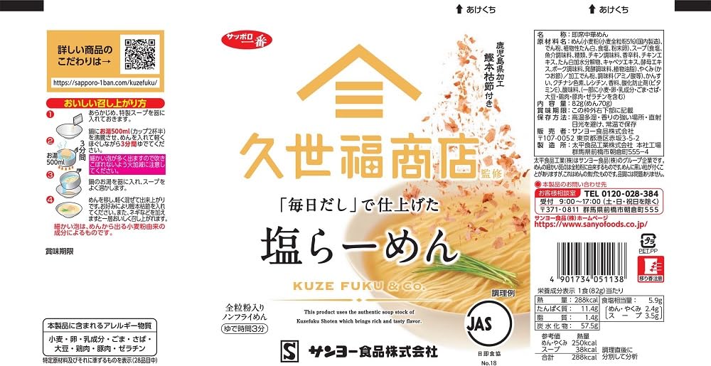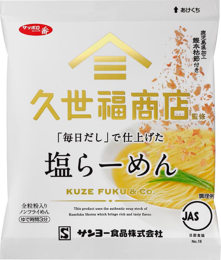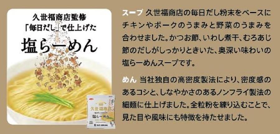 久世福商店監修の袋麺を発売いたします。全粒粉入りのノンフライ麺と毎日だし粉末をベースにチキン、ポーク、野菜のうまみを合わせ、かつお節、いわし煮干、むろあじ節などのだしがしっかりときいた奥深い味わいの塩らーめんです。