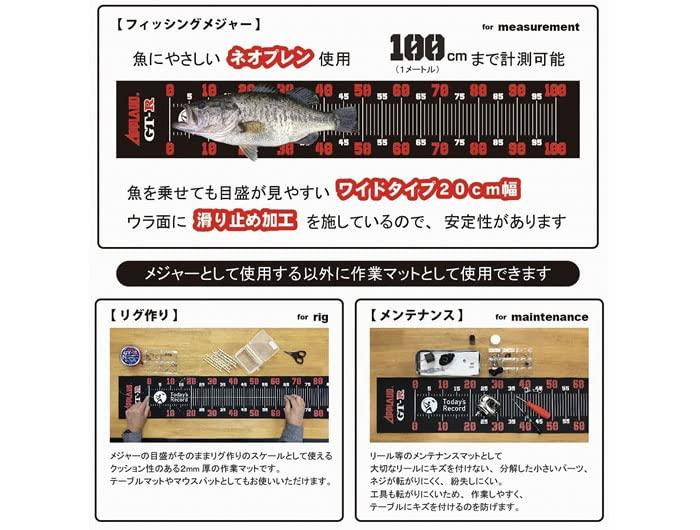 魚にやさしい【ネオプレン素材】を採用し、計測時の魚への負担を軽減させます!計測サイズも【最大1メートル(100cm)】まで測定可能! 魚を乗せても目盛りが見やすい横幅20cmのワイドタイプ仕様!裏面には【滑り止め加工 (十字)】を施しているので、撮影時の安定性も抜群な仕上がり!シート厚さもクッション性のある【2mm厚】を採用、ネオプレーン素材によりパーツや工具などが転がりにくく、自宅・釣り場での急なリグ作り・リールチェック時のマットやスケールとしてもお使いできます!
