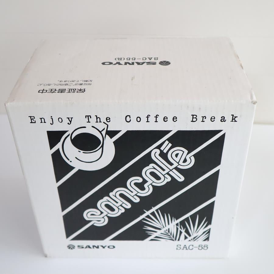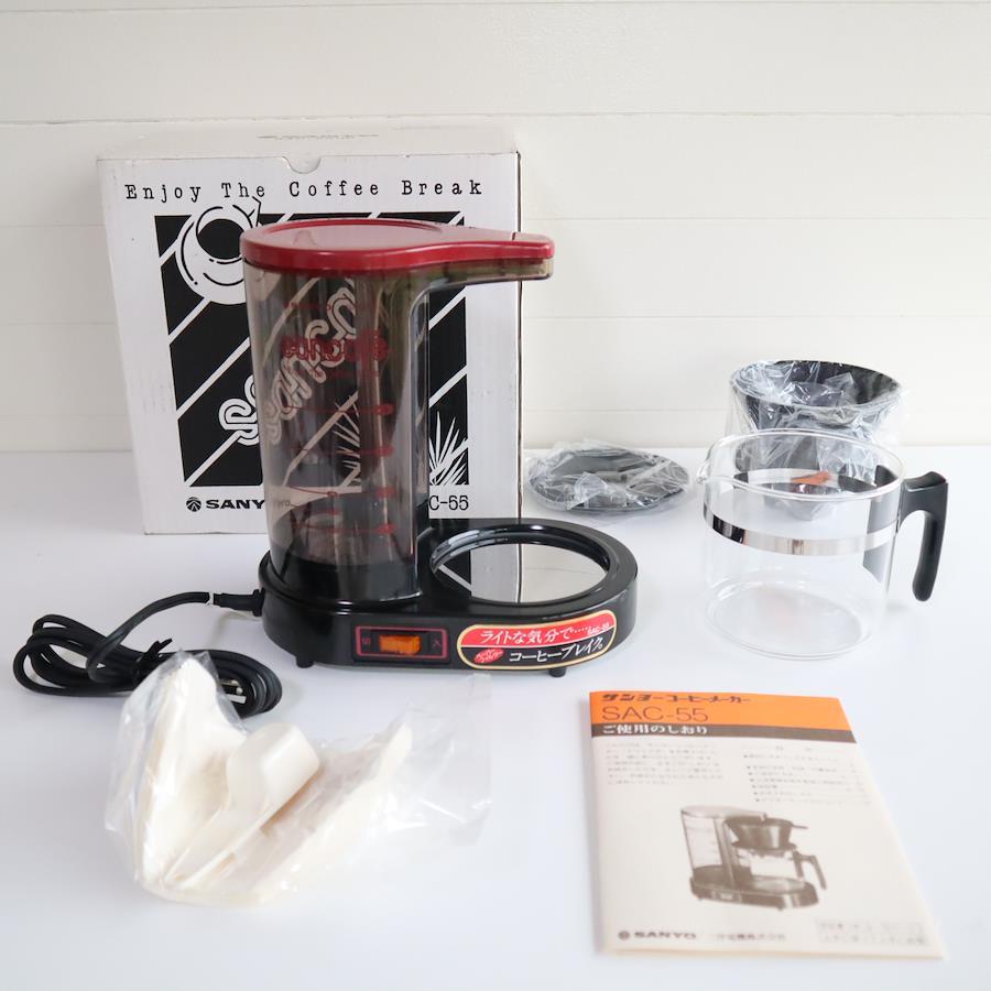 昭和レトロなデザインが魅力のサンヨー製コーヒーメーカー「SAC-55」です。ブランド自体が既に存在しないため、コレクションやインテリア用途にもおすすめです。開封済みですが未使用長期保管品を動作確認のために一度だけ湯通ししており、問題なく使用可能です。この商品は一点ものにつき基本的に再入荷はございませんのでお早めにご検討ください。