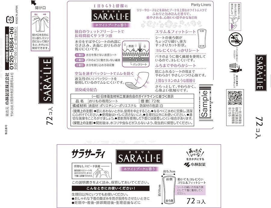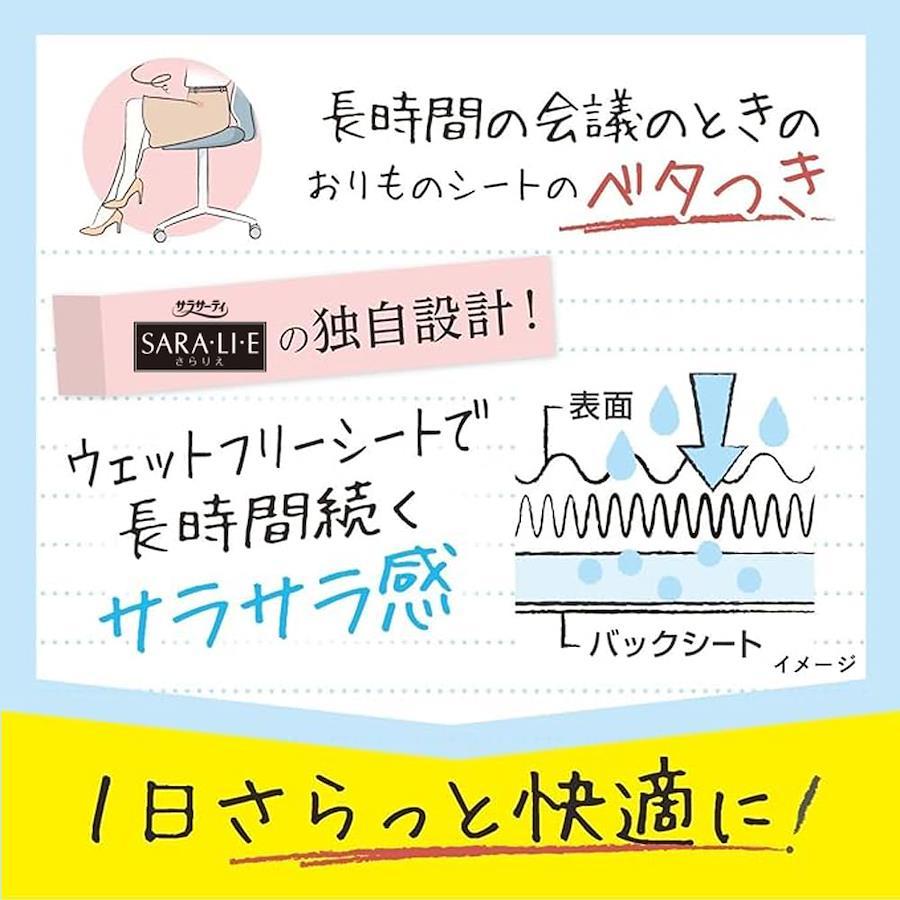 ・妊娠中・産後・排卵期前後・生理前後などに 1日さらりと清潔に過ごすためのおりものシート 新改良※されたウェットフリーシートでサラサラ感UP※当社従来品(サラサーティSARA・LI・E ホワイトブーケの香り:2021年8月まで販売)との比較 お尻スッキリ設計の後方スリムカット形状 動いてもヨレにくい ふちまでやわらかシートでやさしいつけ心地