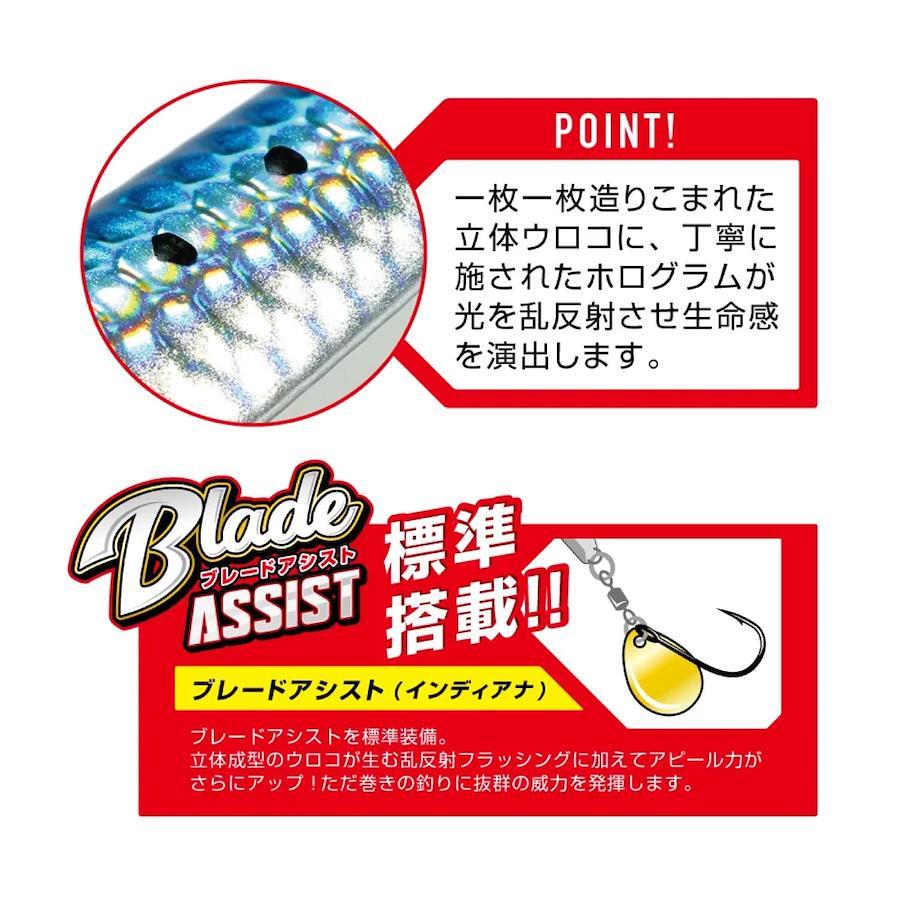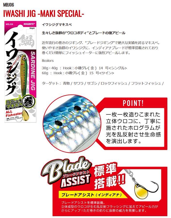 マグバイト MBJ06イワシジグマキスぺ!!生々しさ抜群の“ウロコボディ”とブレードの強アピール!近年流行の巻きのジギング、“ブレードジギング”で絶大な実績を誇るマキスペ。使いやすさ抜群のイワシジグに、インディアナブレードが標準搭載されており巻くだけ簡単にフィッシュイーターに強烈アピールします。ブレード標準搭載でブレードジギングにも!!POINNTは、一枚一枚造りこまれた立体ウロコに、丁寧に施されたホログラムが光を乱反射させ、生命感を演出します。