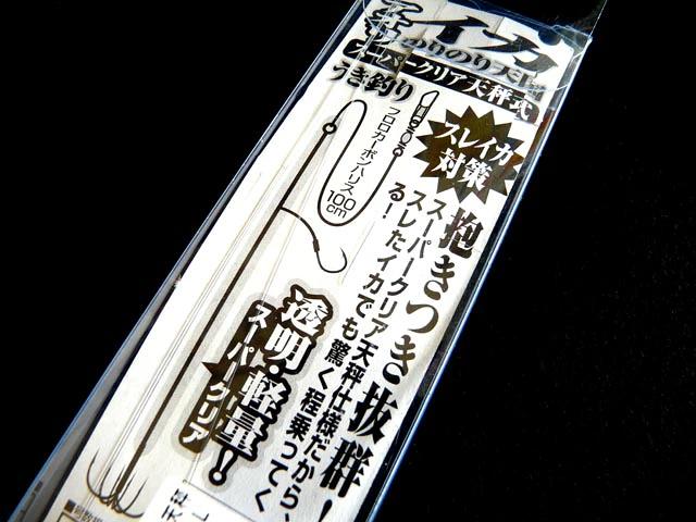 アオリイカのウキ釣りでスレイカ対策として、掛け針手前からアジ針付近までを透明・軽量の「スーパークリア天秤」とし、アオリイカに警戒されにくい仕掛けとなっています。