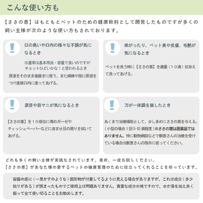 ~こんな使い方があります~●口の臭いや口内の不調などが気になる時…原液をそのまま歯磨きに使う。また、綿棒とか指に原液を薄めずそのまま点け、口内に直接塗ってあげる。●痒がったり、またペット臭や皮膚や毛艶などが気になる時…ペットを洗う時にシャンプーに「ささの恵」を適量(10滴位)加えて洗ってあげる。●涙目や目やにが気になる時…「ささの恵」を10倍位に薄めて、ティッシュペーパーやガーゼなどに含ませ、目の周りを拭いてあげる。●万が一、体調を崩した時…あくまでも治療の補助として、少し多めに「ささの恵」を与える。