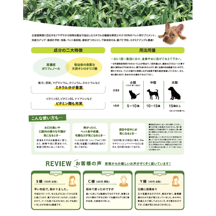 添加物等を一切使用せず、クマ笹だけを原材料とした、ペットの毎日の体調管理を目的としている自然健康食品です。
