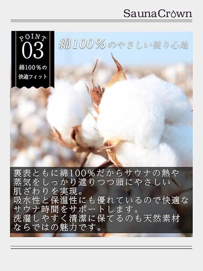 サウナの熱や蒸気をしっかり遮りつつ、頭にやさしい肌触りを実現。