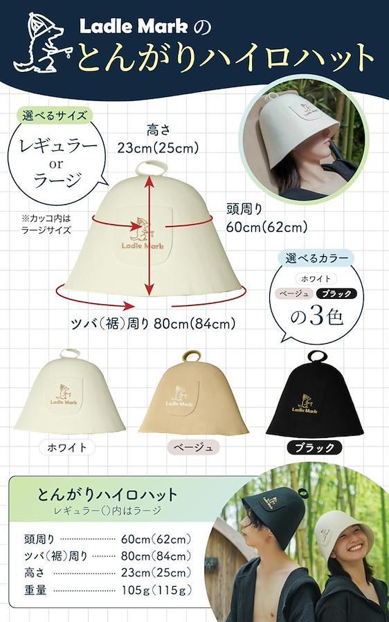 「老若男女問わずに誰でもオシャレになれるデザイン」頭周り62cm+ツバ周り84cm+高さ25cmの計算され尽くしたサウナハットのデザインは老若男女問わず似合う形となっています。ポケットについているワンポイントのハイロ君ロゴがまた映える。