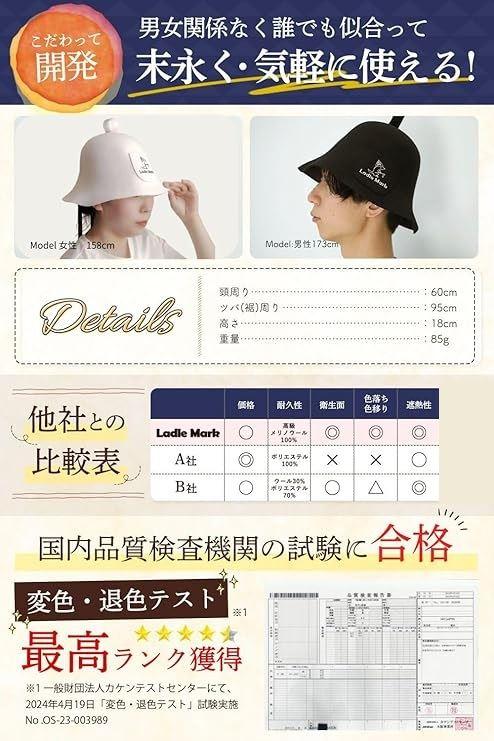 「国内品質検査機関の試験合格」汗や洗濯、紫外線などによる変色・退色耐久試験で星4.5個を獲得。色移りや色落ちを気にせず、末永くご使用いただけるサウナハットとなっています。
