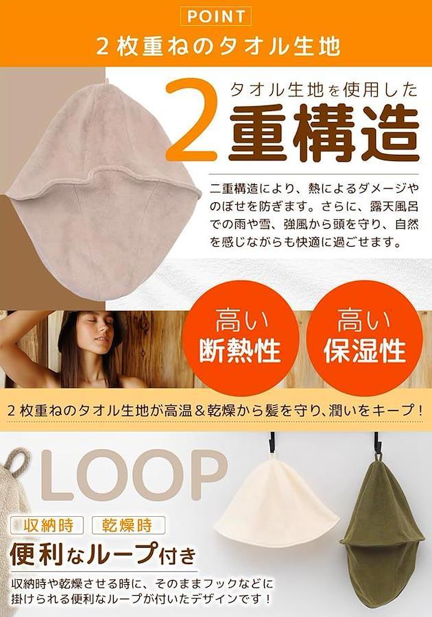 露天サウナも快適にするサウナハット 」 2枚重ねのタオル生地が高温&乾燥から髪を守り、潤いをキープ。