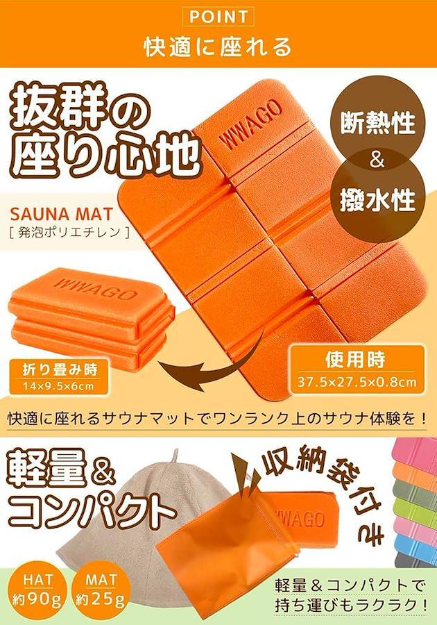 「商品内容」サウナハット:1枚 付属:サウナマット+マット収納袋 「仕様」サウナハットサイズ:頂点からフチまでの長さ(深さ) 約22.5cm 周り約58cm 、素材:綿78%+ポリエステル% 重量:約90g サウナマット:37.5cmx27.5cmx0.8cm (折り畳み時 14cmx9.5cmx6cm) 重量 約25g、素材:発泡ポリエチレン