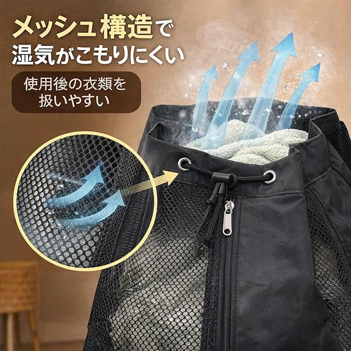 温泉・銭湯にも通気構造で濡れ物を扱いやすいメッシュ設計 温泉や銭湯で使ったタオルや衣類を気兼ねなく入れられるよう、バッグ全体を通気性の高いメッシュとナイロンで構成しています。
