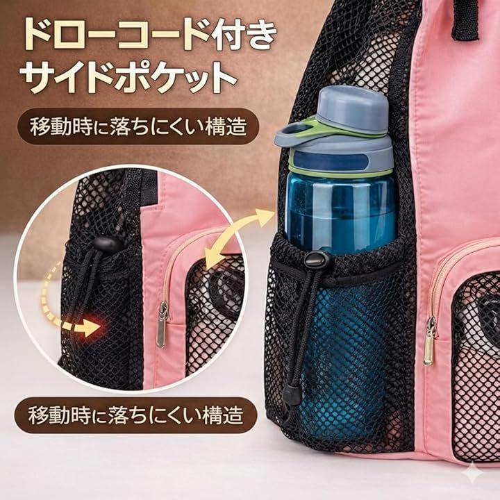 サイドには高さのあるボトルを入れられるメッシュポケットがあり、固定用のドローコードで落下を防ぎます。