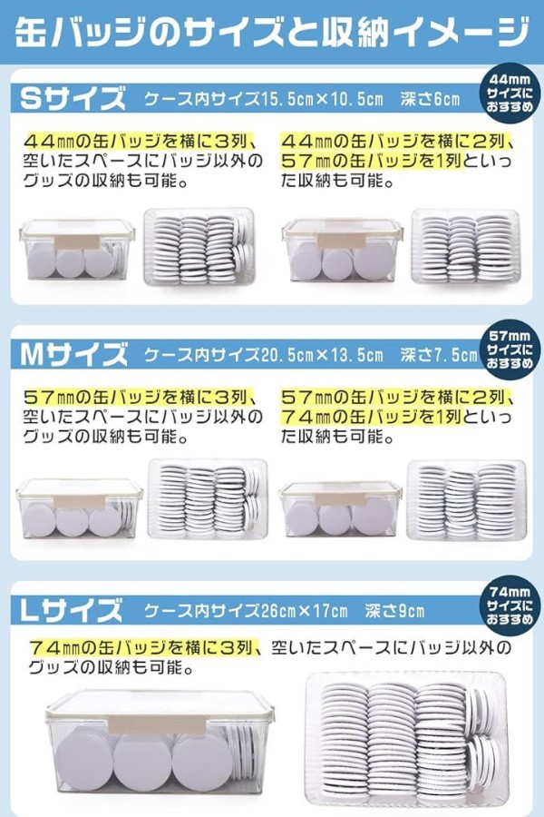 小さめから大きめまで、推しの缶バッジに合わせてぴったり収納可能。