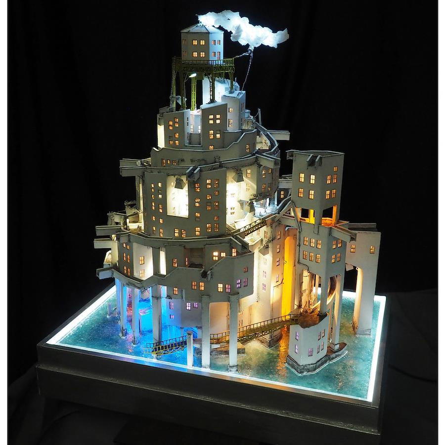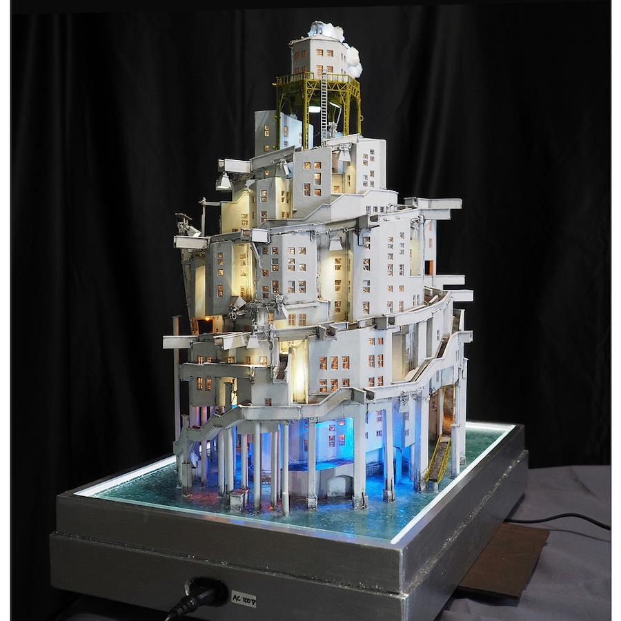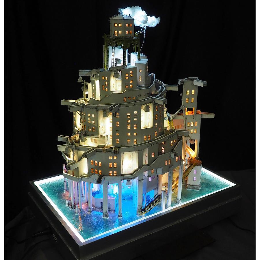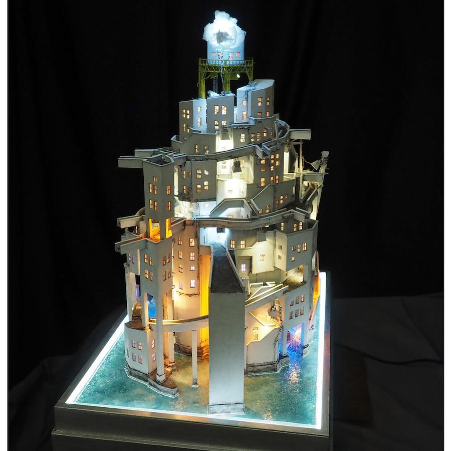 主な使用材料: アクリルケース(防塵用・押出し透明3mm)、ボール紙、イラストボード、透明アクリル板(窓部分・0.2mm厚)、木材(台座部分=シナベニア、ラワンベニア、アガチス単板)、艶消しアクリル絵具(ホルベイン・アクリラガッシュ)、ターナー「MILK PAINT・スノーホワイト」、