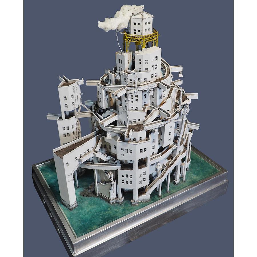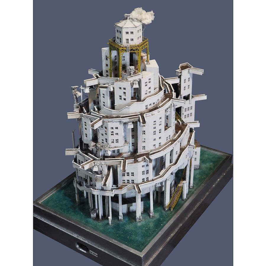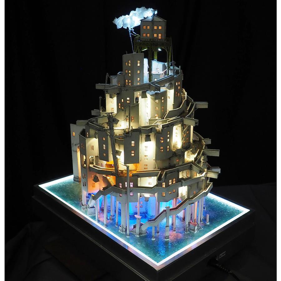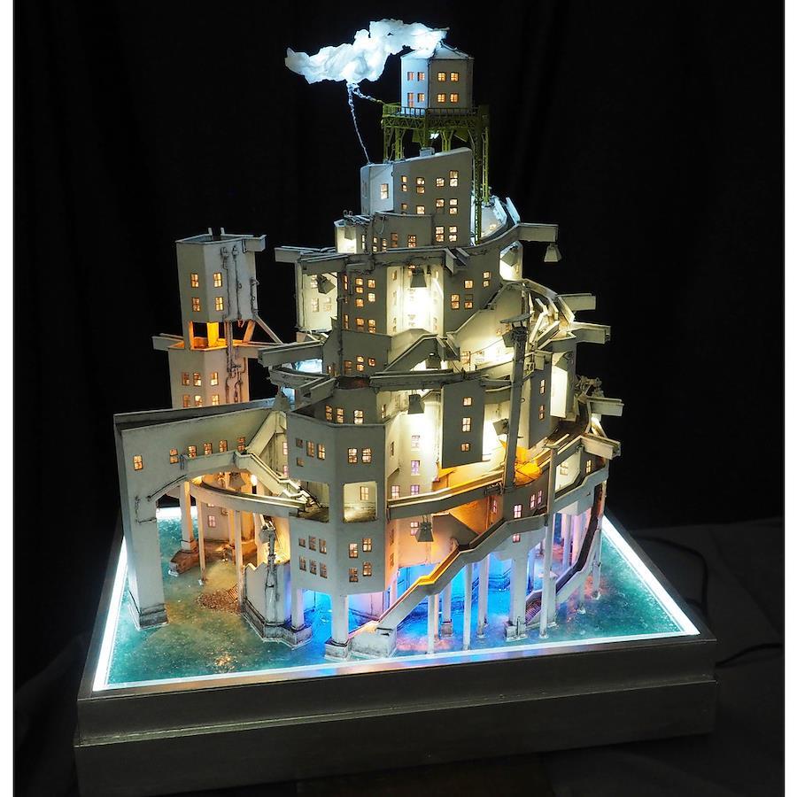 主な使用材料: アクリルケース(防塵用・押出し透明3mm)、ボール紙、イラストボード、透明アクリル板(窓部分・0.2mm厚)、木材(台座部分=シナベニア、ラワンベニア、アガチス単板)、艶消しアクリル絵具(ホルベイン・アクリラガッシュ)、ターナー「MILK PAINT・スノーホワイト」、