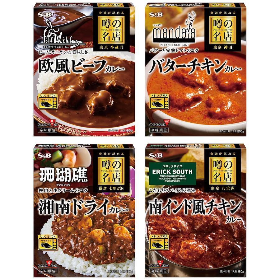 有名店監修の「噂の名店」シリーズの人気カレー4種セットです。4種類×各1個種類:欧風ビーフカレー、バターチキンカレー、湘南ドライカレー、南インド風チキンカレー【重要】メーカーによる商品リニューアルに伴いパッケージ(内容量も含む)変更が行われた場合、新パッケージでお届け致します事ご了承願います。