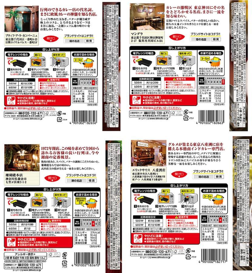 【欧風ビーフカレー】ハーブ煮込み牛肉(国内製造)(牛肉、食塩、香辛料)、牛脂豚脂混合油脂、野菜(玉ねぎ、しょうが、にんにく)、ソテー・ド・オニオン、乳等を主要原料とする食品(脱脂粉乳、牛乳、ホエイパウダー、その他)、リンゴペースト、小麦粉、バター、デキストリン、砂糖、ビーフペースト、バナナピューレ、オニオンパウダー、カレー粉、玉ねぎエキス、食塩、香辛料、ビーフエキス/カラメル色素、調味料(アミノ酸等)、増粘剤(加工デンプン、増粘多糖類)、pH調整剤、乳化剤、香料、(一部に小麦・乳成分・牛肉・大豆・バナナ・豚肉・りんごを含む)【バターチキンカレー】香草蒸し鶏肉(タイ製造)(鶏肉、でん粉、食塩、砂糖、香辛料)、トマトペースト、生クリーム、バター、カシューナッツペースト、コーン油、チキンエキス、野菜(にんにく、しょうが)、砂糖、香辛料、食塩、酵母エキス、香味油/増粘剤(加工デンプン、増粘多糖類)、パプリカ色素、pH調整剤、香料、乳化剤、調味料(核酸)、(一部に小麦・乳成分・カシューナッツ・大豆・鶏肉を含む)【湘南ドライカレー】食肉(牛肉(オーストラリア)、豚肉)、野菜(玉ねぎ、にんにく)、ソテー・ド・オニオン、マッシュルーム、グリンピース、バター、牛脂豚脂混合油脂、カレー粉、小麦粉、乳等を主要原料とする食品(バターオイル、パーム油、脱脂濃縮乳、パーム核油、その他)、乳糖、砂糖、トマトピューレー、香辛料、マンゴーチャツネ、ビーフエキス、食塩、生クリーム、ビーフブイヨンパウダー、野菜ペースト、チキンブイヨンパウダー、白ワイン、チーズ/カラメル色素、調味料(アミノ酸等)、増粘多糖類、香料、酸味料、(一部に小麦・卵・乳成分・牛肉・大豆・鶏肉・豚肉・りんごを含む)【南インド風チキンカレー】香草蒸し鶏肉(タイ製造)(鶏肉、でん粉、食塩、砂糖、タイム)、トマト・ジュースづけ、ソテー・ド・オニオン、なたね油、チキンエキス、野菜(しょうが、にんにく)、トマトペースト、食塩、クミン、マスタード、焙煎香辛料ペースト、シナモン、コリアンダー、ターメリック、ブラックペッパー、カルダモン、フェネグリーク、酵母エキスパウダー、パプリカ、赤唐辛子、クローブ、フェンネル、ガーリック、ジンジャー/増粘剤(加工デンプン、増粘多糖類)、調味料(アミノ酸等)、香辛料抽出物、pH調整剤、パプリカ色素、塩化Ca、香料、(一部にごま・大豆・鶏肉・豚肉を含む)