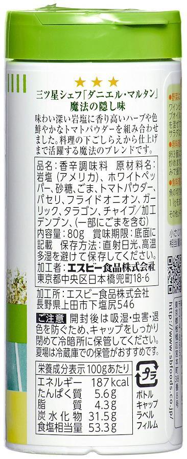 岩塩(アメリカ)、ホワイトペッパー、砂糖、ごま、トマトパウダー、パセリ、フライドオニオン、ガーリック、タラゴン、チャイブ/加工デンプン、(一部にごまを含む)