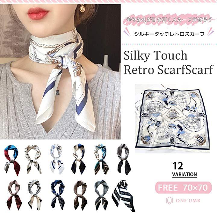 ・クラシカルかつレトロな華やかさが目を引くシルク調スカーフが登場。 滑らかな肌触りと上品なデザイン。