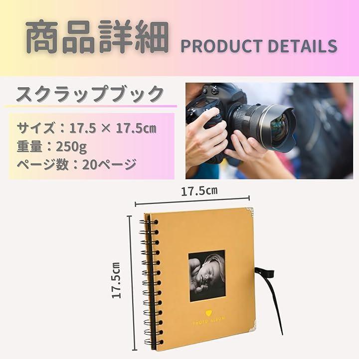 「商品詳細」サイズ:17.5 x 17.5cm 重量:250g ページ数:20ページ このおしゃれなスクラップブックは、手作りの楽しさを存分に味わいながら、大切な思い出を美しく保存できるアイテムです。