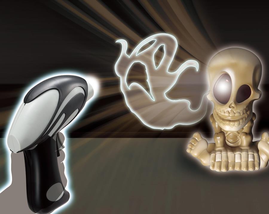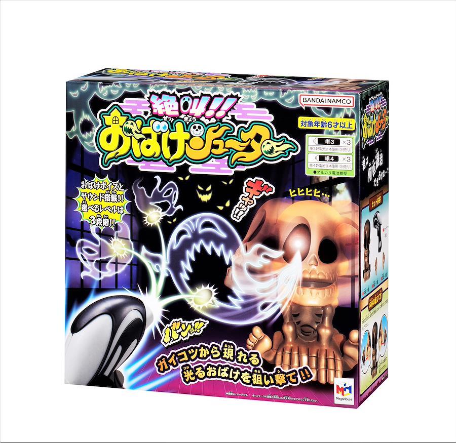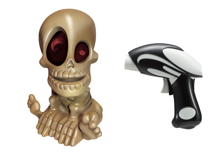 絶叫!おばけシューターが登場! 壁にうつったおばけをねらい撃て! ガイコツから壁に投影(とうえい)されるおばけをシューターで撃ち、あたれば点数ゲット! 難易度は全部で3段階。最後に倒したおばけの点数の発表があります。