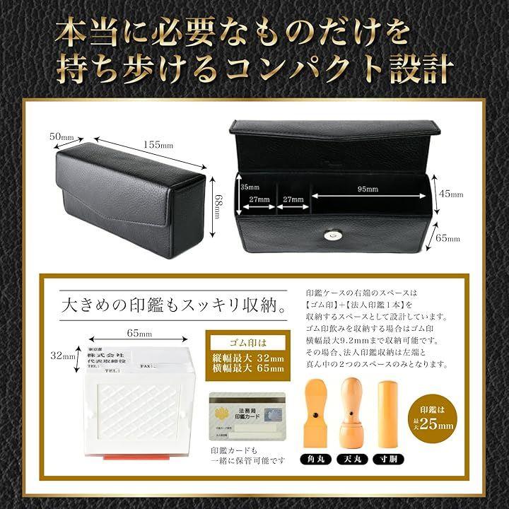 商品詳細・用途:法人印鑑ケース、ハンコケース・素材:牛革・印鑑ケースサイズ:横155mmx縦50mmx高さ68mm・印鑑サイズ:25mmまで・ゴム印サイズ:縦幅32mmx横大65mmまで(ゴム印のみで右端のスペースを利用する場合は横幅92mmまで)・ブランド名:73−3