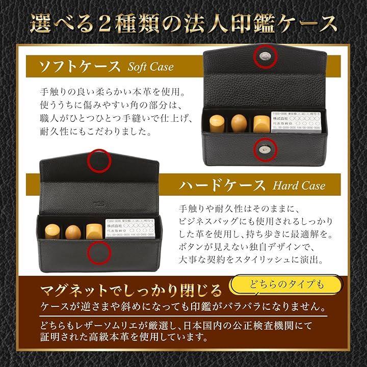 ・「サイズや素材について」*印鑑ケースサイズ:横155mmx縦50mmx高さ68mm *印鑑サイズ:最大25mmまで *ゴム印サイズ:縦幅最大32mmx横幅最大65mmまで(ゴム印のみで右端のスペースを利用する場合は横幅最大92mmまで) *素材:牛革 *ソフトとハードの違い:ソフトはふかふか柔らかい手触りとボタンが見えるのが特徴、ハードはしっかりと硬いケースで、ボタンが見えないようになっているのが特徴で、その分開閉しやすく、見た目もスタイリッシュです。
