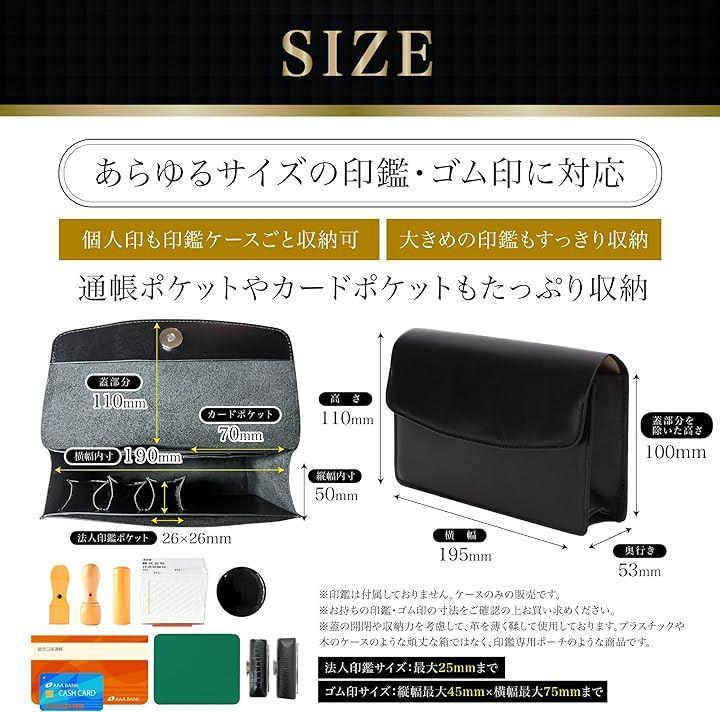 「サイズや素材について」*印鑑ケースサイズ:横195mmx縦53mmx高さ110mm *印鑑サイズ:最大25mmまで *ゴム印サイズ:縦幅最大45mmx横幅最大75mmまで(柔らかいレザーを使いやすいように薄く鞣しているため、最大値でも他の収納アイテムによっては多少ゆとりがある設計です) *素材:牛革(オイルレザー)