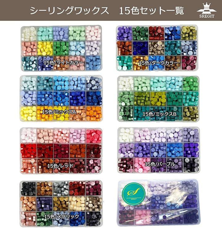 「ワックスサイズ」0.8x0.8x0.4cm 「ケースサイズ」10色:13x7x2.5cm/100g 15色:18x11x2.5cm/200g 24色:19x14x2.5cm/300g 「数量」10色セット(約170粒)/15色セット(約250粒)/24色セット(約400粒) 「セット」ライトカラー/ダークカラー/ミックスA/ミックスB/レッド/パープル/メタリック 「カラー」赤・青・白・黒・緑・紫・金・銀・銅など