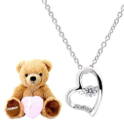 ネックレスと可愛いテディーベア(ぬいぐるみ)の限定ギフトセット。Sears シアーズブランドのオリジナルデザイン「ラブ ハートネックレス」。シェイプを加えたハートは甘さの中に も上品さが輝く、大人かわいいデザイン。胸元で優しく揺れ、輝き続ける「ダンシングストーン」デザインと、スワロフスキー(R)・ジルコニアの最高位の輝きを採用した、かわいさとエレガントさどちらも兼ね備えたハートジュエリー。【ダンシングストーンとは】胸元で振動するように揺れて輝く、ダンシングストーン。石だけが躍る(Dance)ように振動することが特徴。左右の丸カンで結ばれて、前後に細かく揺れて輝きます。クロスフォー社が開発したこの特殊な技術は数々のメディアで取り上げられ、日本特許を取得し国際特許も申請中。ダンシングストーンだけの魅力で、世界中の女性のハートを虜にしています。■石:スワロフスキー?・ジルコニア ■石の大きさ:2.5mm/1.0mm(3石) ■サイズ:縦約11.5mm/横約9.5mm/厚み約5mm ■地金:スターリングシルバー(シルバー925) ■チェーン:あずき約40cm(スターリングシルバー(シルバー925))/アジャスター5cm ■無料付属:テディベア/ショッパー