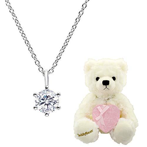 ■サイズ:トップ 9mm×6mm(バチカン含) / チェーン 40cm■石:キュービックジルコニア 直径 約5mm (約0.5ct相当)■素材:真鍮■付属品:テディベアー(約180mm×140mm)、専用ギフトバッグ、ハート型ジュエリーBOXダイヤモンドも凌ぐ圧倒的な輝き。誰もが魅了される贅沢な輝き。遠目で見ても映える、眩しすぎるほどの輝き。果てしなく純粋な輝きを次々と投げかけます。石を美しく見せる6本爪で、飽きのこない贅沢なデザイン。オフィスからパーティーシーンまで、どんなシーンでも活躍します。大切な方へのギフト、プレゼントに最適です かわいいテディベアーと一緒にお届け致します。テディが足を出しちゃう乙女心くすぐる専用ギフトバッグに入れて、大切なあの人を喜ばせてみませんか?部屋に飾っておいてもかわいいセットです。クリスマス、ホワイトデー、結婚記念日等に女性への贈り物としてオススメの人気アクセサリーです。