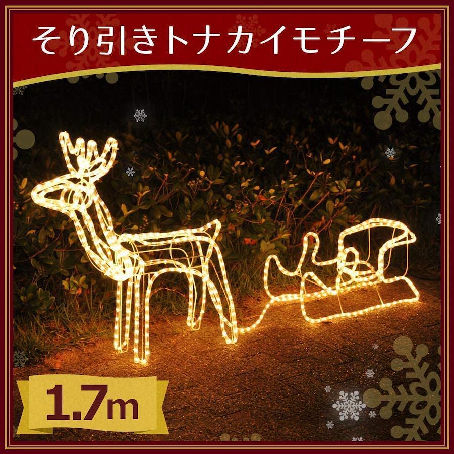 ご自宅や店舗先でのイルミネーションに!とっても可愛いトナカイ型のイルミネーションモチーフ! 防雨・防滴仕様で、雨にぬれても安心。ベランダ・テラスに置いて飾ることが出来ます 白熱電球タイプを使用しているので、LEDでは再現できない暖かみのある色合いを楽しめます ソリを引くトナカイの躍動感は、まるで本物!ひときわ目立つこと間違いなし! 【商品詳細】全長(約):175cm/トナカイサイズ(約):69.5×67×14cm/ソリサイズ(約):59×23×29cm/電源コード長さ:約150cm/防雨加工