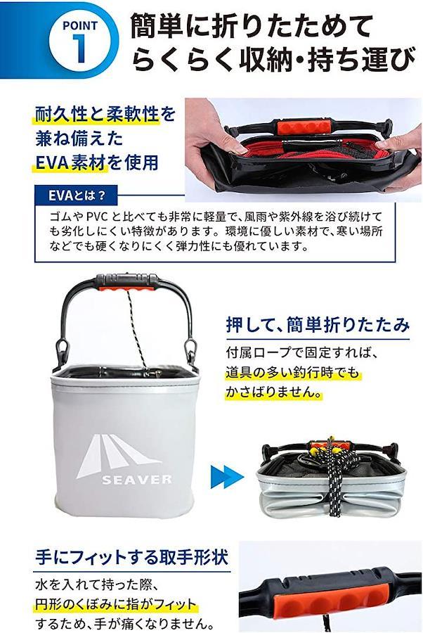 「商品仕様」バケツ(持ち手含む) 使用時 22 x 22 x 35cm 折りたたみ時 22 x 22 x 8cm 容量 9L 重量 350g, プライヤー 6 x 16.5 x 1.5cm 重量 160g, フィッシュグリップ 6 x 16.5 x 1.5cm 重量 65g